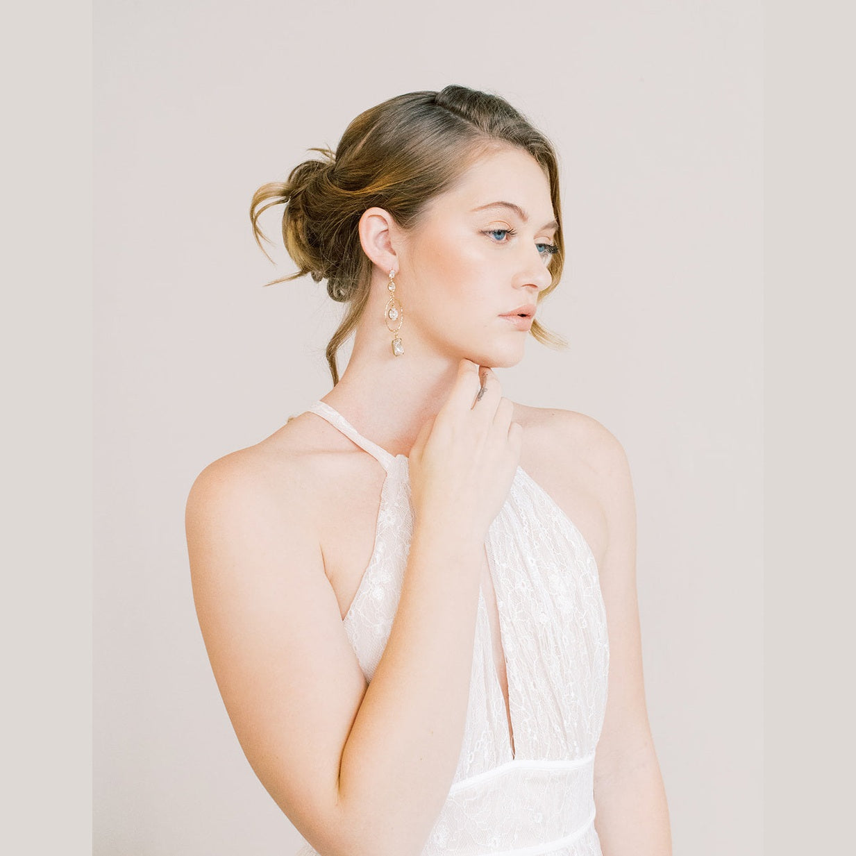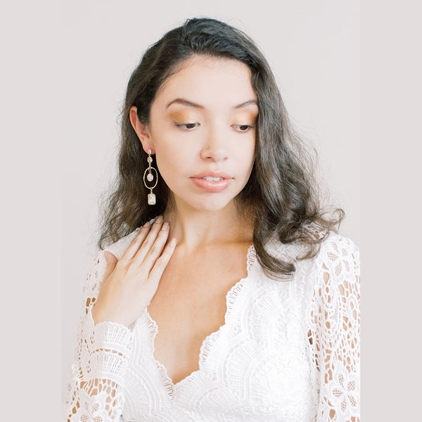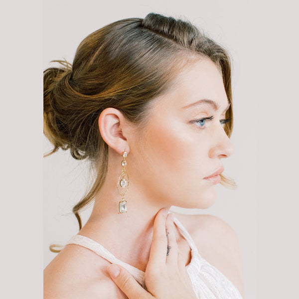 Three layers of clear sparkling Swarovski crystals make up these oval statement earrings. These pieces are hung from gold plated (over sterling silver) posts. Gorgeous pieces for a bride, bridal party, or any special occasion.